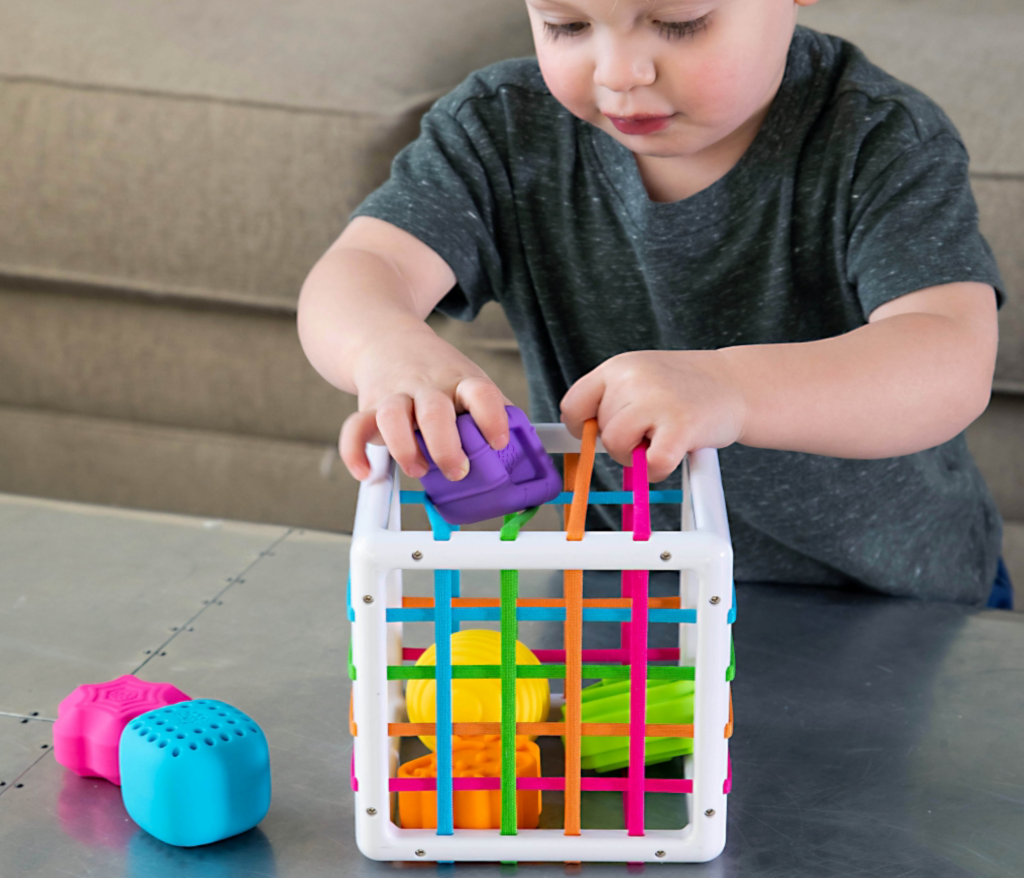 カラフルで伸縮性のあるヒモが、格子状や直線状に張り巡らされたベビートイです。ヒモの間からブロックを入れたり、抜いたりして楽しむことで、お子さまの認識力や想像力を養います。