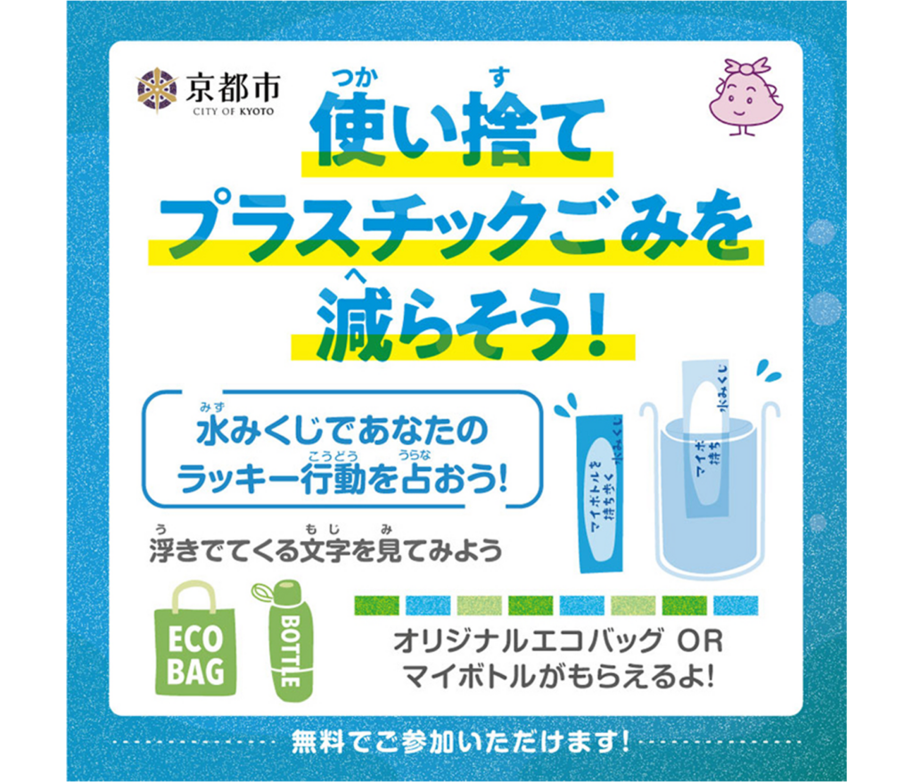 京都市では、使い捨てプラスチックごみの削減に向け、マイボトル利用促進、レジ袋削減、プラ容器包装・プラ製品の分別回収など、さまざまな取組を実施しています。